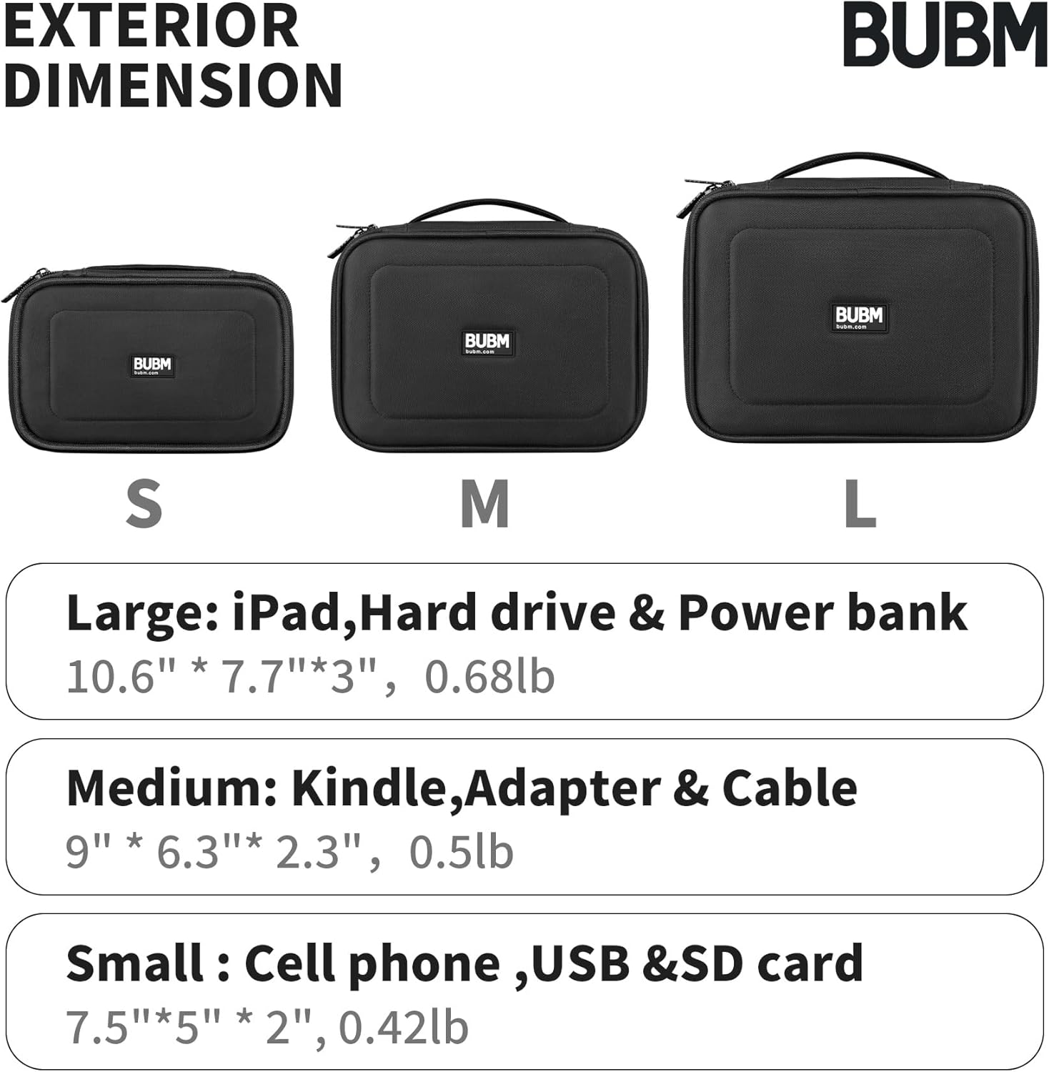 Good Organizer: This cable organizer bag comes in three sizes. The large size is 10.6 by 7.7 by 3 inches and weighs 0.68 pounds. Medium size: 9 by 6.3 by 2.3 inches, weight: 0.51 lb. The small size is 7.5 by 5 by 2 inches and weighs 0.42 pounds.
